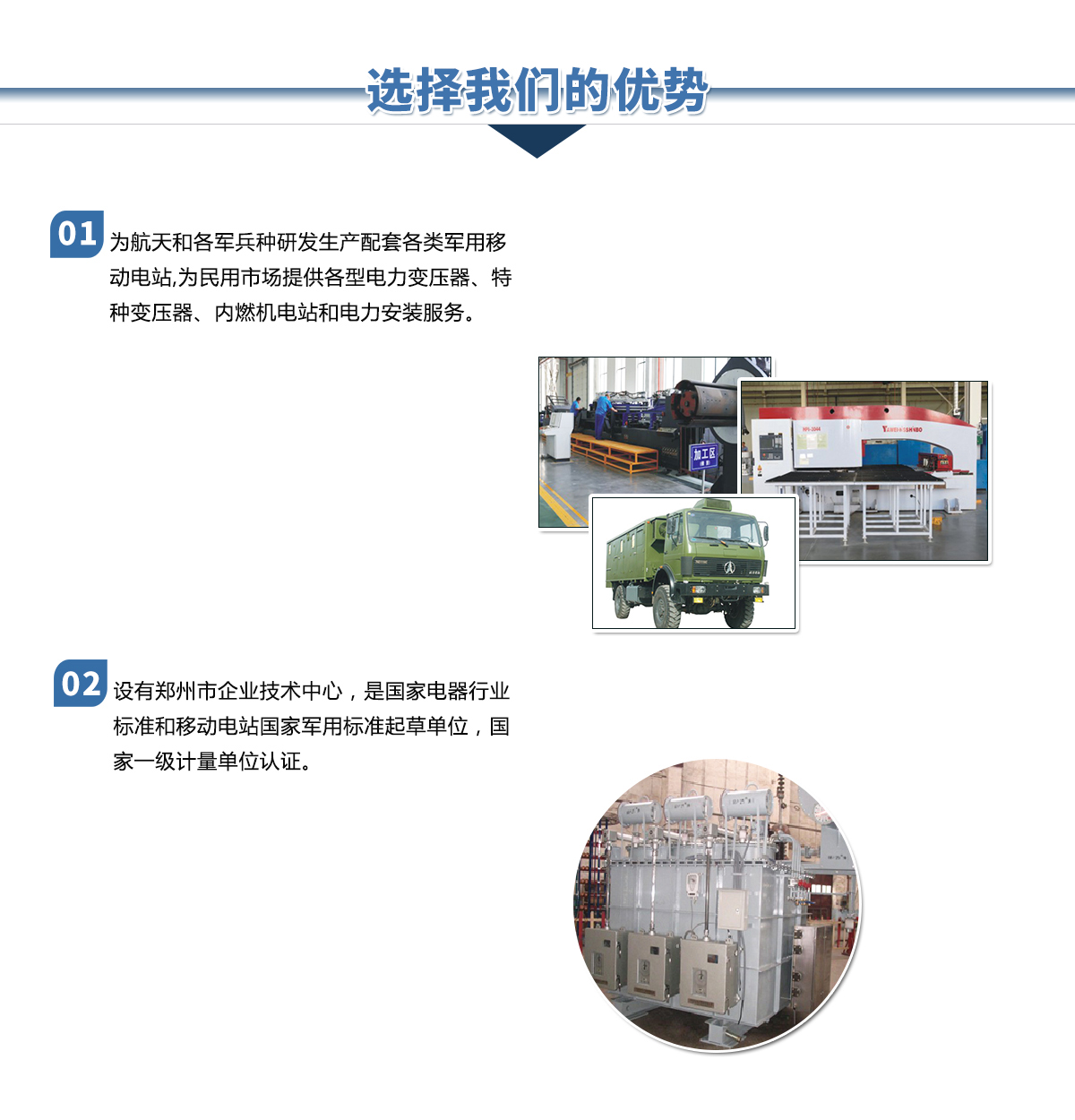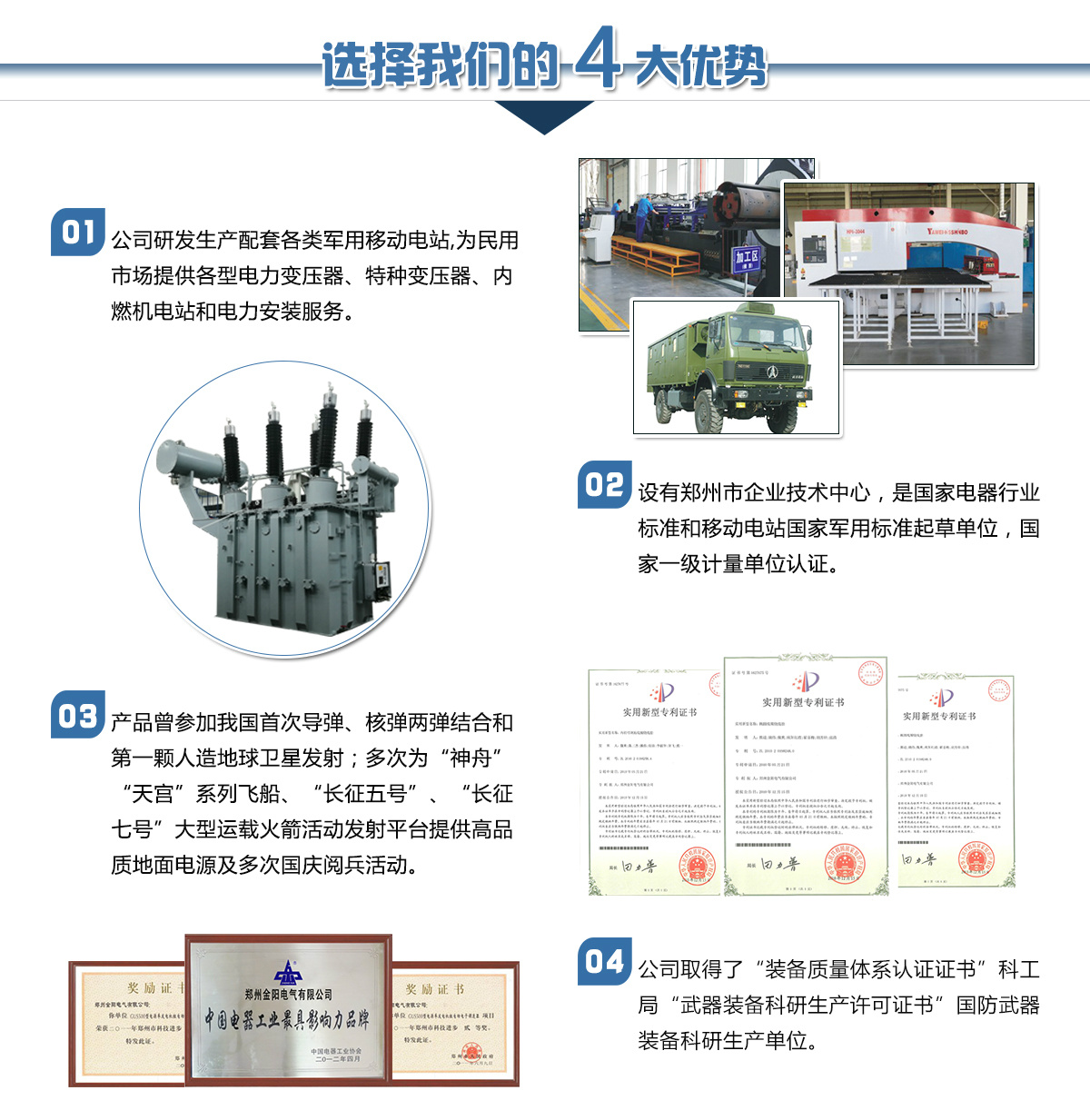 鄭州金陽電氣有限公司是由鄭州市國(guó)資委控股的國(guó)有獨(dú)資企業(yè),是原機(jī)械工業(yè)部在上世紀(jì)五十年代投資建立的移動(dòng)電站和電力變壓器生產(chǎn)企業(yè)。公司下設(shè)電站公司和變壓器公司及其它配套公司,長(zhǎng)期以來在國(guó)內(nèi)移動(dòng)電站和電力變壓器行業(yè)占有重要位置。是河南省具備設(shè)計(jì)生產(chǎn)110kV電壓等級(jí)以上電力變壓器資質(zhì)的企業(yè),是國(guó)家經(jīng)貿(mào)委首批推薦城鄉(xiāng)電網(wǎng)建設(shè)與改造所需變壓器的生產(chǎn)企業(yè)。河南省變壓器檢測(cè)中心設(shè)在我公司。